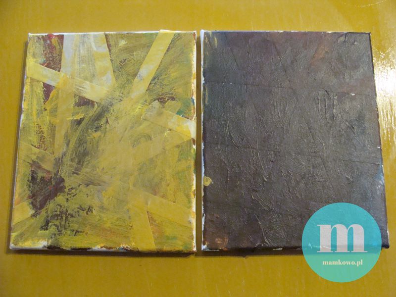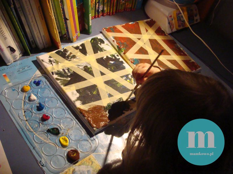 Pomalowane wcześniej płótna okleiłam taśmą malarską tworząc geometryczny wzór. I znów dałam córce pędzel w dłoń.