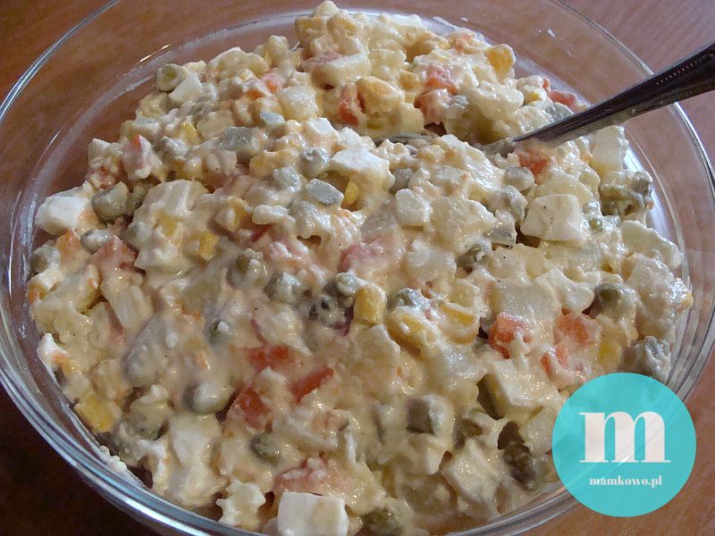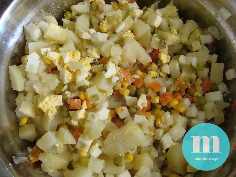 Wszystkie składniki kroimy w kosteczkę (no, poza groszkiem i kukurydzą oczywiście), dodajemy tyle majonezu, aby skleił całość, doprawiamy solą i pieprzem (serio, ta sałatka więcej przypraw nie potrzebuje).