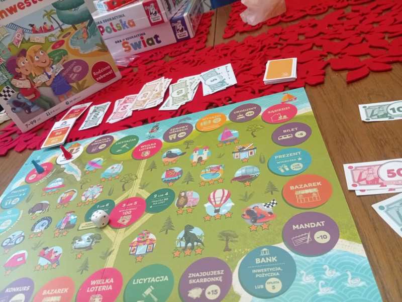„Jedyna taka gra o pieniądzach” – „Mały inwestor”. Przyznam się, że gdy zobaczyłam małe banknoty, pomyślałam, że ta gra będzie kopią „Monopoly”. Nic bardziej mylnego. Gra od Kapitana Nauki uczy inwestowania. Pieniądze są, bo być muszą, ale oprócz tego jest 30 kart przedsiębiorczości, 8 kart inwestycji i 4 karty pożyczek. Mamy tu też wielką loterię, licytacje, wycieczki i pożyczki, które mają swoje reguły. Chwilę nam zajęło ogarnięcie reguł gry, ale opłaciło się.