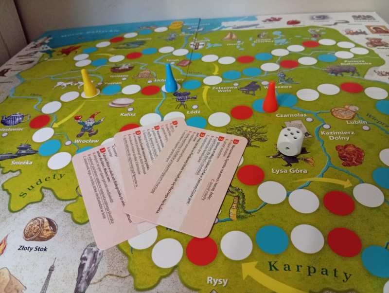 „Polska” ma podobne zasady. Ale tu są warianty: wariant z wykorzystaniem plakatu podczas losowania kart niebieskich, wariant z wykorzystaniem plakatu podczas losowania kart czerwonych i wariant dla 2 graczy lub 2 drużyn. No właśnie, bo jeszcze jest piękny plakat… Jak napisał twórca gry, grać można do momentu gdy pierwszy zawodnik dotrze do mety (wariant dla niecierpliwych graczy), albo gdy wszyscy dotrą do mety (wariant dla cierpliwych). Czego można nauczyć się z „Polski”? M.in. po co warszawska Syrenka ma miecz i tarczę, na jaką głębokość można zjechać w kopali węgla w Katowicach, co zimuje w bunkrach w okolicach Międzyrzecza, czy jak poruszają się ruchome wydmy koło Łeby.